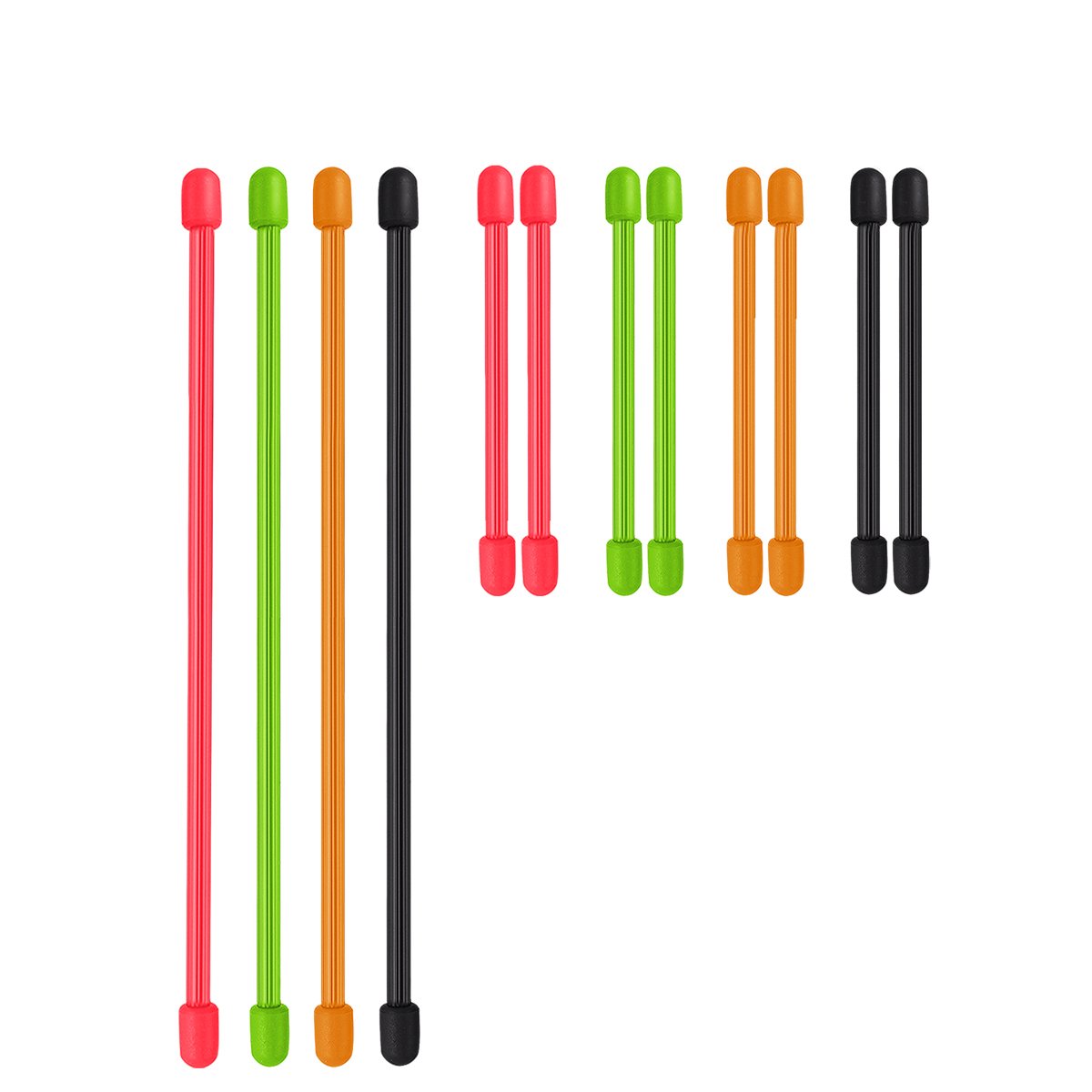 The AusKit rubber gear ties are so versatile they will become invaluable. The uses are endless. To initially test them out I used them as cord wraps for a surge protector and a USB charging cable. I have since used them for enclosing bags and keeping pens together in a drawer. The set includes 8 of the shorter 3" ties. 2 each of Black, Green, Orange and Red. She longer ones measure 6 inches long and you receive 4 in total. One each of Black, Green, Orange and Red. These ties are a rubber coated wire with protective ends. They are textured to prevent slippage when in use.