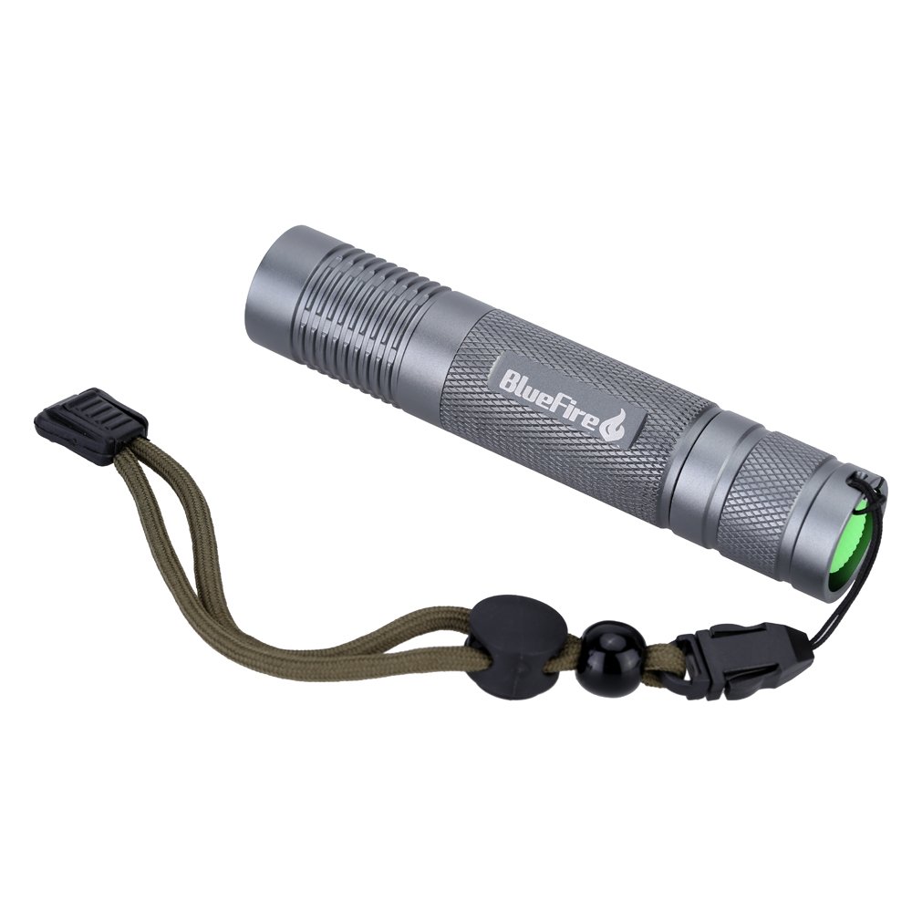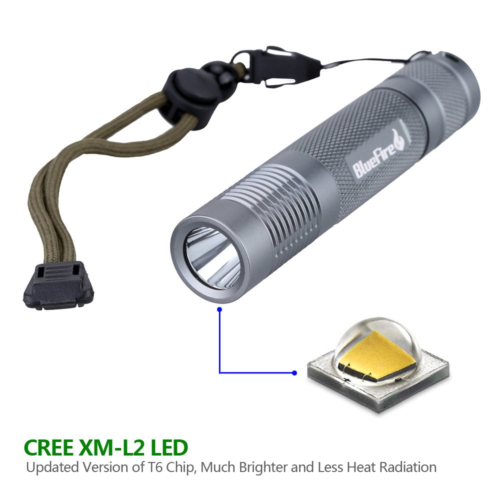 Many manufacturers like to claim that their product is a "military-grade flashlight", but what does this really mean? Without citing any specific MILSPECs, the phrase is mostly a vague marketing term meant to imply that the product is ruggedized and survivable in extreme operating conditions. With that said, build quality on this BlueFire is excellent, with a high-quality aluminum housing that's rugged, strong, and handsome. You can use it to bash a window for emergency egress, or strike an attacker for self-defense. When shined in the eyes of an attacker, it will temporarily blind and daze your assailant. The tailcap screws off to hold an 18650 battery and a double set of rubber O-rings seal out water. There's no wasted space of any kind, making the flashlight very compact. It has a good amount of heft to it that makes it feel really solid in the hand. The strap is nicely made, with a spring-loaded button that lets you adjust the loop diameter so you can secure it around your wrist.