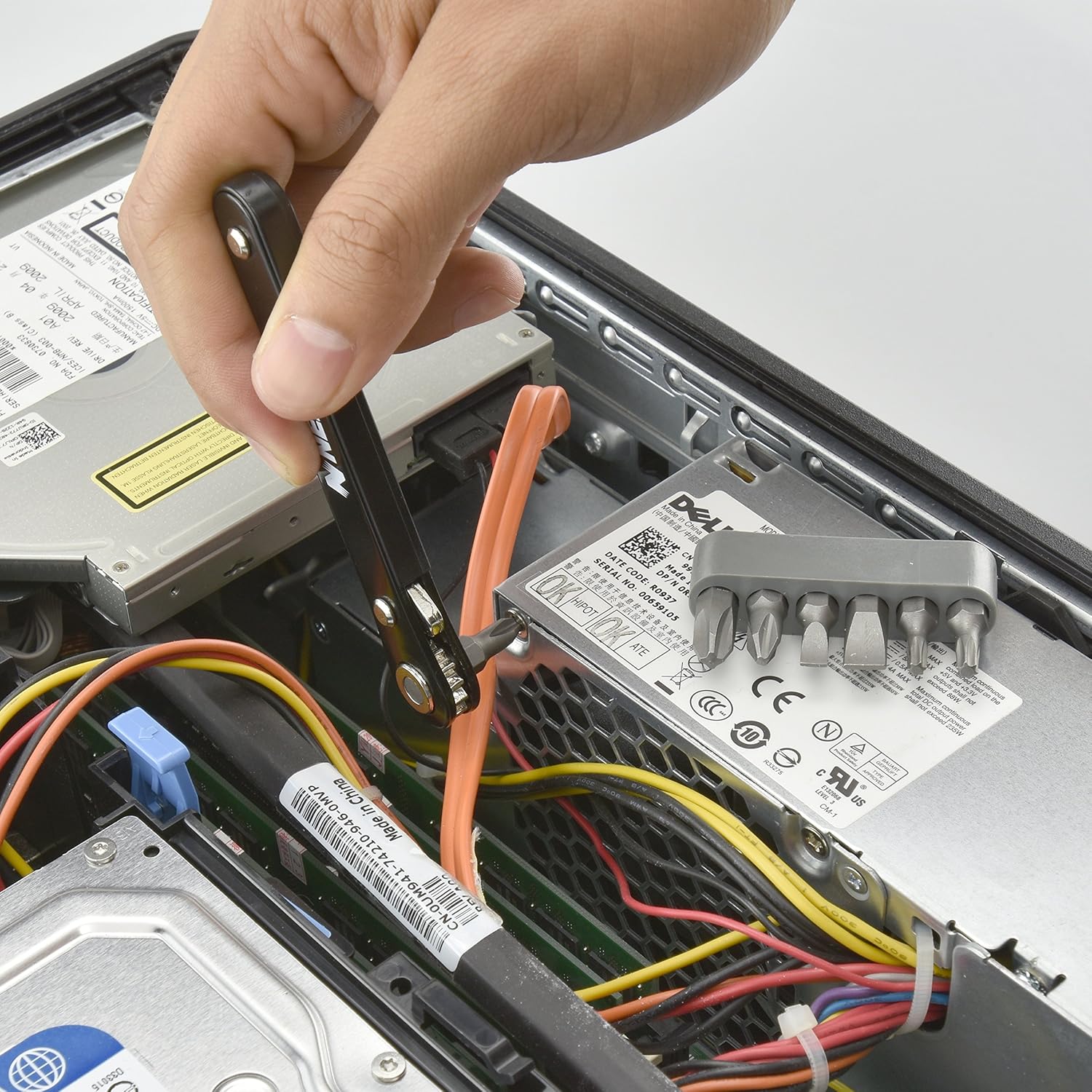 This right angle ratchet screwdriver is only 4 inches long and comes with 6 different screw types and sizes. It's very useful in tightening screws in deep areas where space is limited. I recommend using a longer screw head for added clearance and better torque.