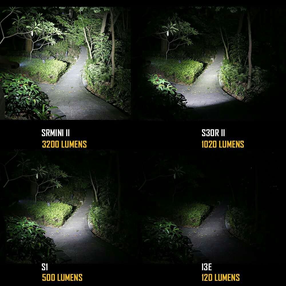 the pictures depict the brightness of the Olight on the RIGHT compared to the different lumen settings ("8 lumens", "50 lumens", "130 lumens") of the Fenix E12 on the LEFT