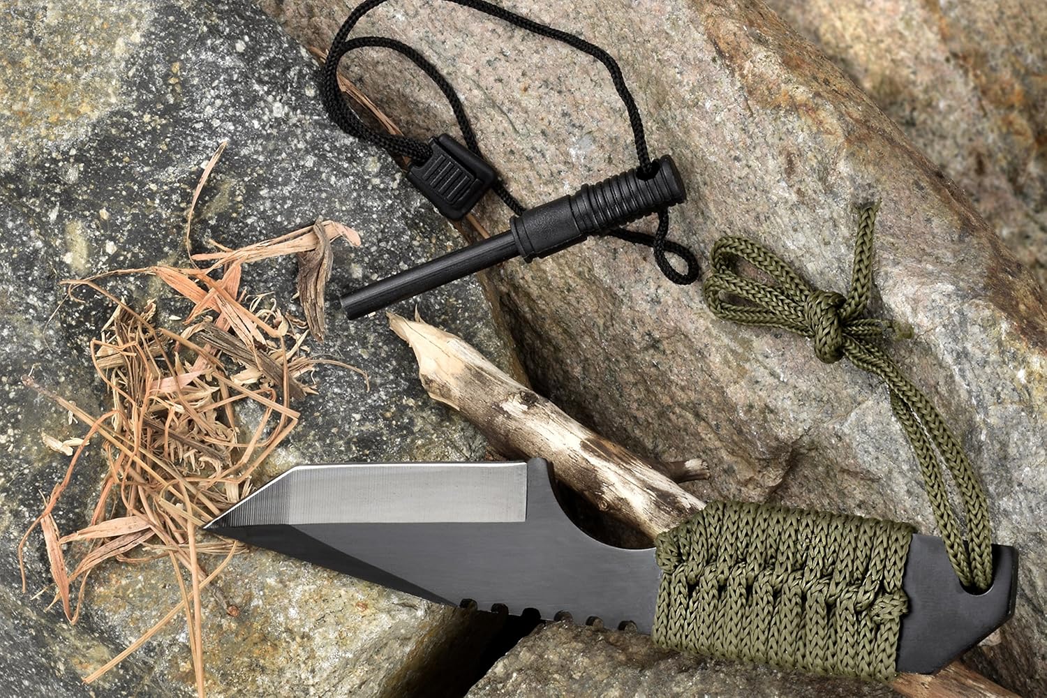The Survivor Fixed Blade Outdoor Knife (model HK-106320) features a black tanto blade and a 2-tone green cord-wrapped handle, with a 7-inch overall length. Ideal for camping expeditions and survival training, this Survivor full tang knife features a 3-inch, 4mm black stainless steel tanto blade. The cord wrapped handle gives you superior grip in even the wettest of conditions, while also providing easily unwrapped cordage when needed in a pinch. The included magnesium alloy fire starter enables you to effortlessly start a fire in no time. This knife comes complete with a nylon sheath for easy and safe carry. Geared toward outdoor activity, Survivor offers a wide variety of classic survival knives and rugged fixed blade knives.