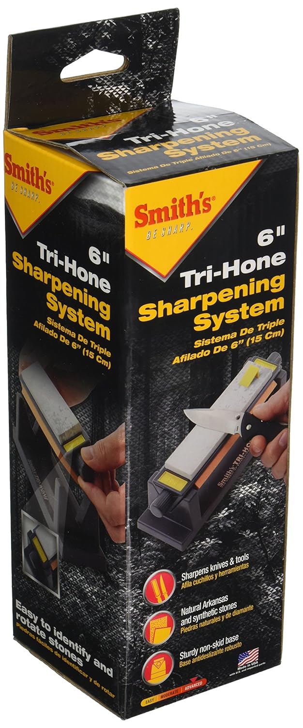 Smith's TRI-6 three-stone sharpening system features a medium Arkansas stone, fine Arkansas stone, and coarse synthetic stone mounted on a molded plastic triangle with handles on the end for easy stone rotation and easy-to-read stone identification. The sturdy molded plastic base has nonskid rubber feet for safety, "V" trough to catch the oil drippings, and is easy to clean. A bottle of Smith's premium honing solution and a sharpening angle guide are also included.
