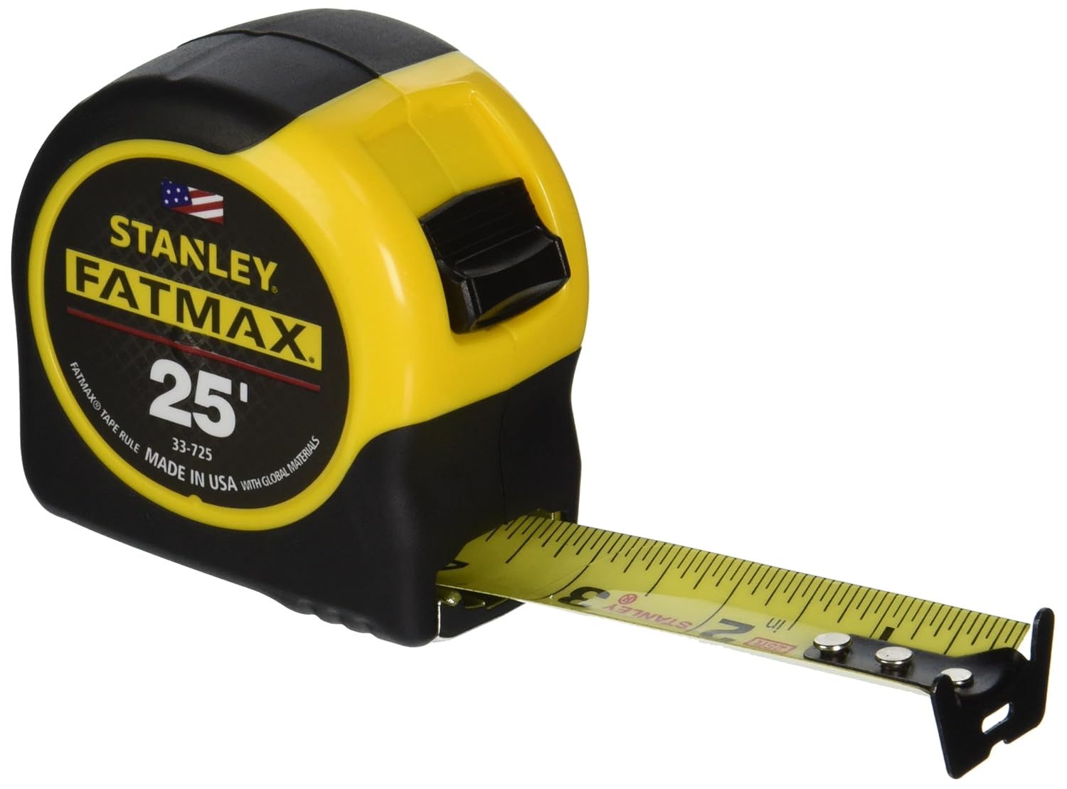 FAT MAX TAPE RULE 1-1/4 wide 11' standout Contractor grade Mylar coated blade Plastic case with rubber non-slip grip Belt hook Clamshell 25' Long Amazon.com The Stanley 25-Foot FatMax Tape Measure is reinforced on the first six feet with BladeArmor coating for maximum durability. A Mylar polyester film extends the life of the entire blade. This tape rule comes with a cushion grip built into the case for a non-slip grip and impact resistance. A top forward blade lock design makes it easier to lock and unlock the blade while a heavy, heat-treated spring provides long life and smooth blade recoil. Tape Rule is reinforced with BladeArmor coating for maximum durability. See the full line of Stanley tape rules. Hand tools for the pro or expert enthusiast. view the FatMax product demo (requires Flash) The tape blade measures 25-feet-by-1-1/4-inch with a 11-foot tape standout. To simplify framing jobs, the bright yellow, easy-to-read blade has 16-inch and 19.2-inch stud center markings. It comes with Stanley's limited lifetime warranty. About Stanley FatMax Tape Systems and BladeArmor Coating The FatMax family of products has established itself as one of Stanley's most extensive and innovative product families in the company's 161-year history. The FatMax line of hand tools features core tools essential for the pro or expert enthusiast who desire high quality, durable tools. BladeArmor coating is a patented industrial thermoplastic coating, the very same material that has been used to strengthen and protect aircraft parts, such as the rotor blades on the Sikorsky Black Hawk Helicopter. Simply put, it helps aircraft survive war zones, and it also helps tape blades survive construction zones. Applying BladeArmor coating to tape blades reduces both tape breakage and tape returns, enabling it to conquer the toughest testing ground of all -- the job site!