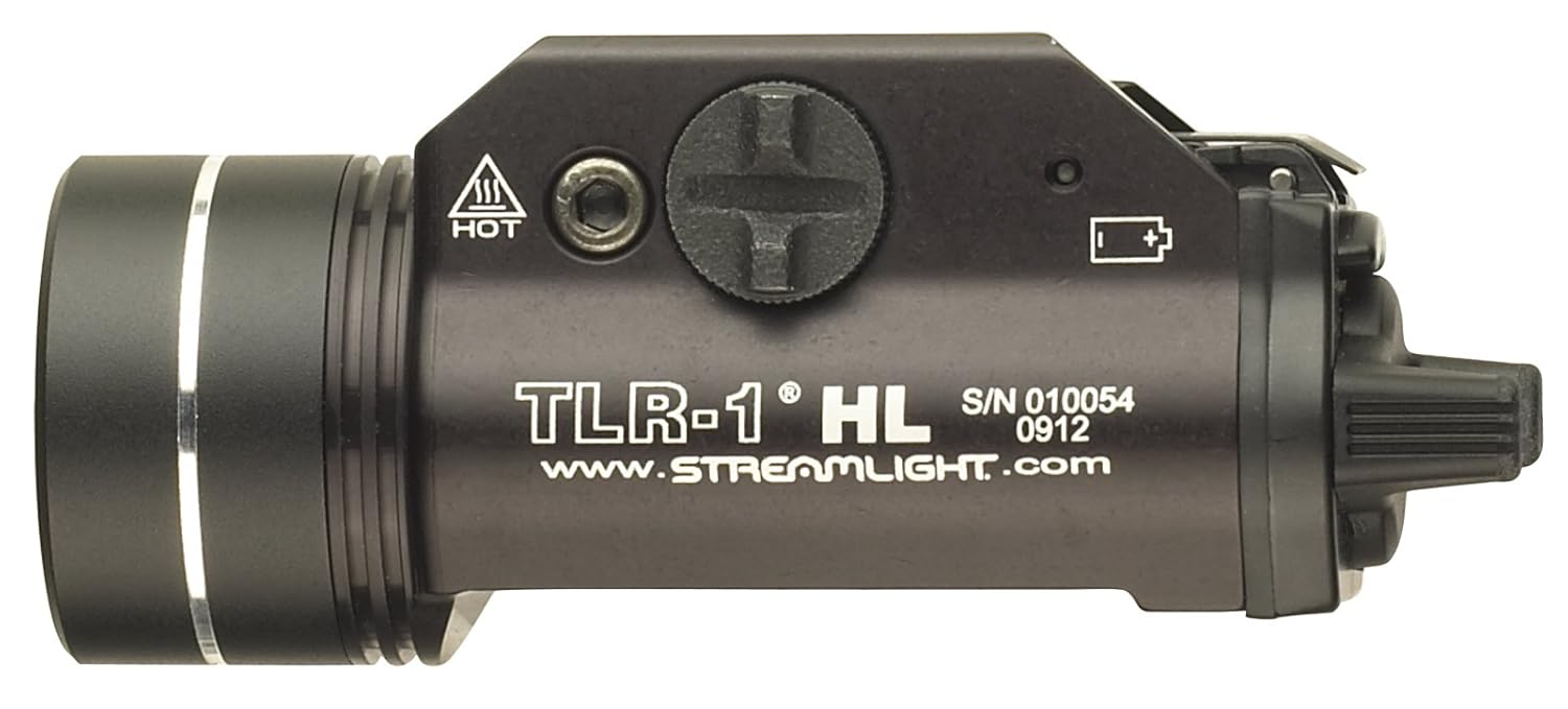 Streamlight 69260 TLR-1 HL High Lumen Rail-Mounted Tactical Light. The TLR-1 HL provides a 800 lumen blast of light for maximum illumination while clearing a room or searching an alley. Its wide beam pattern, lights up large areas so you can identify who or what is nearby. C4 LED delivers 12,000 candela peak beam intensity; 800 lumens. TIR optic produces a concentrated beam with optimum peripheral illumination. Runs 1.25-Hours. Solid-state current regulation for consistent illumination level. It has an ambidextrous momentary/steady On-Off switch. Double tap momentary paddle to activate strobe. Securely fits a broad range of weapons; includes keys for Glock-style, Picatinny, Beretta 90two, S&W 99 and S&W TSW. Mounts directly to handguns with Glock-style rails and to all MIL-STD-1913 (Picatinny) rails. One handed snap-on and tighten interface keeps hands away from muzzle when attaching/detaching. Made up of 6000 series machined aircraft aluminum with anodized finish and shock-mounted glass lens. Tethered battery door and latch mechanism prevents battery door loss while providing easy battery replacement. Operating temperature: -40 to +120 Degree Fahrenheit. IPX7 waterproof to 1-meter for 30-Minutes. User programmable strobe can be enabled/disabled. Powered by two 3V CR123A lithium batteries (included). Serialized for positive identification. Length: 3.39-inch (8.61 cm); Weight: 4.18-ounce (118.6 grams). Comes with a limited lifetime warranty.