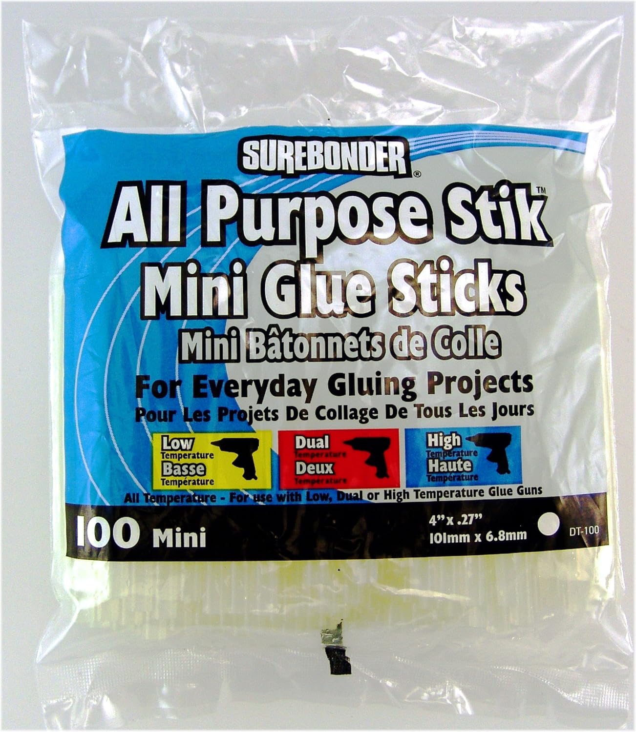 Surebonder all-temperature mini hot melt adhesive works at either low temperature (230 degrees F) or high temperature (380 degrees F) for everyday gluing projects. Use with high or low temperature glue guns. Bonds to metal, wood, paper, fabric, magnets, ceramics, floral arrangements, glass and plastic using a high temperature glue gun. Bonds to delicate materials such as balloons, ribbon, lace and children's crafts using a low temperature glue gun. Clear color with 60-65 second working time. 5/16 -Inch diameter by 4-Inch length. 100 sticks per bag.