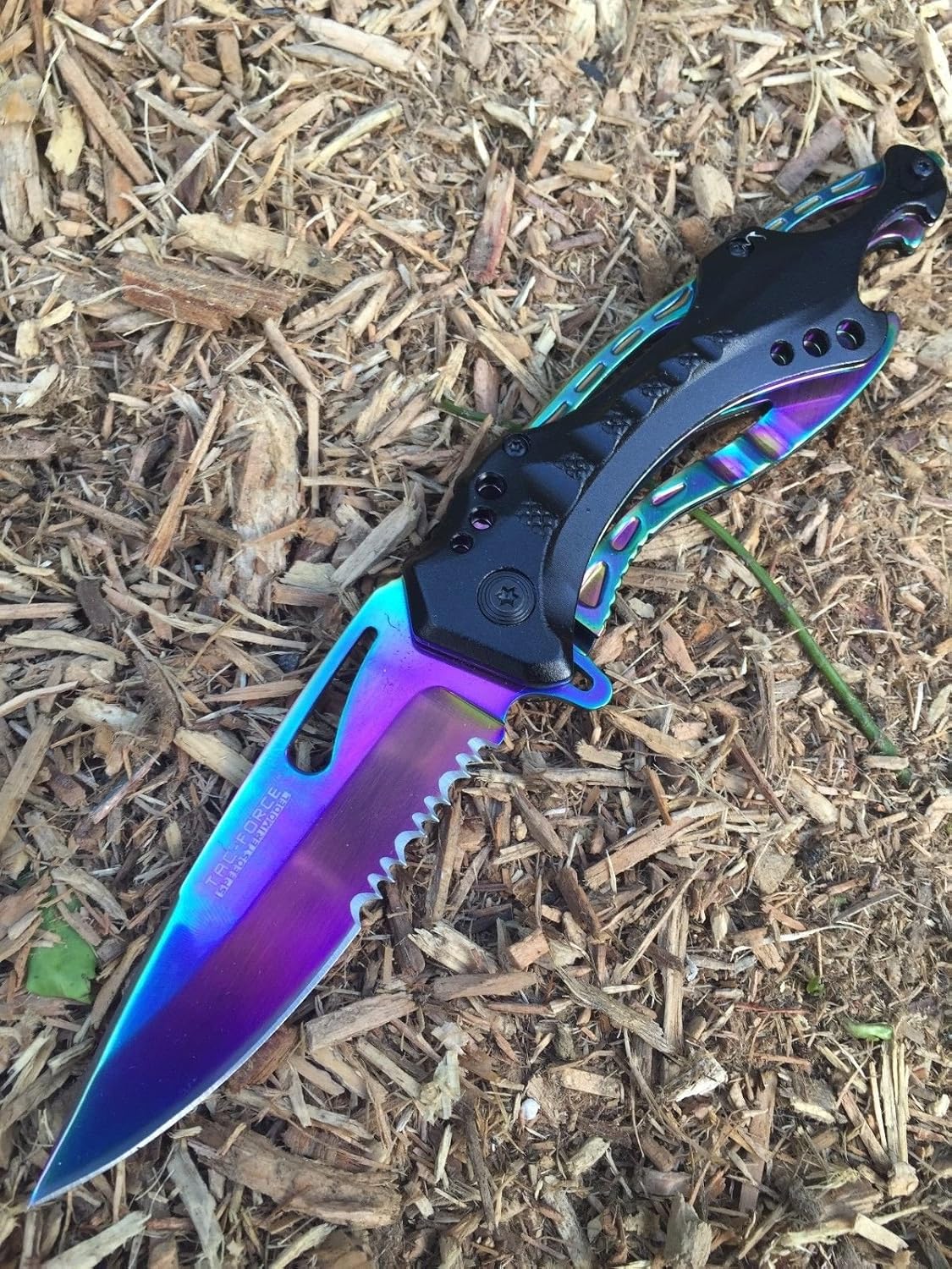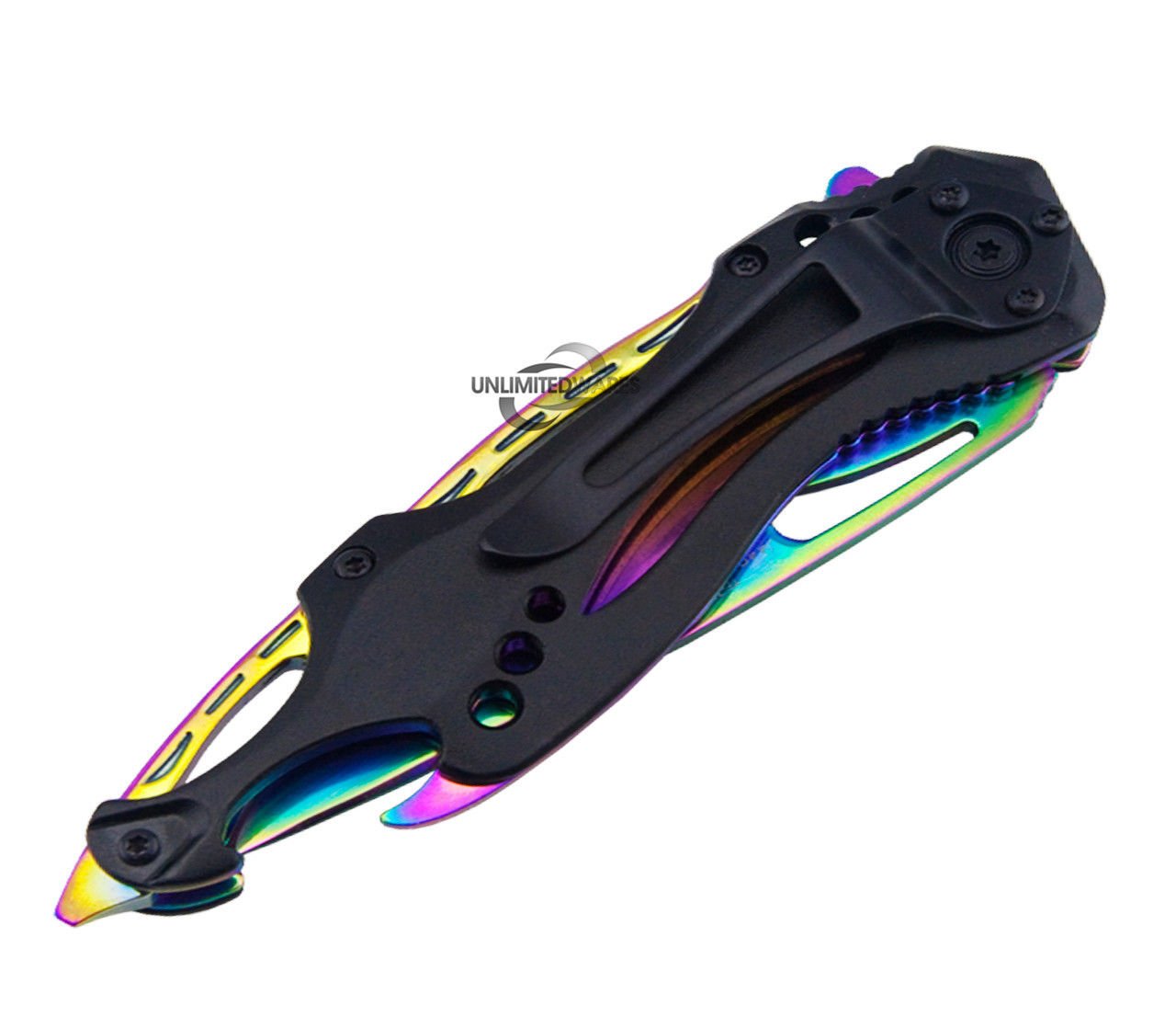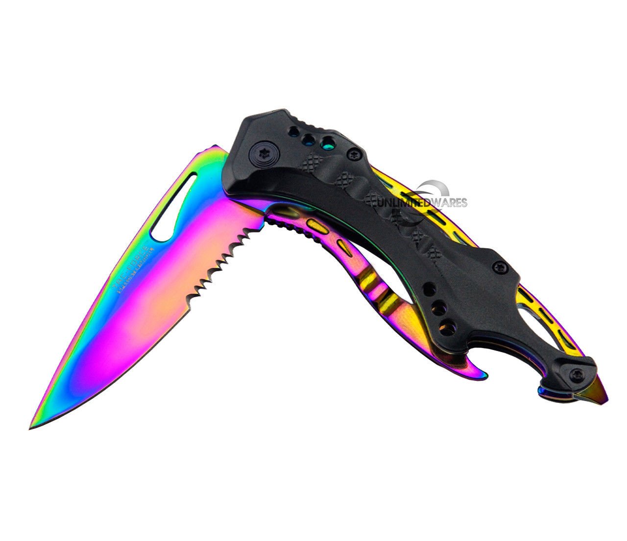 This Speedster Assisted Opening rescue knife by Tac-Force features an awesome rainbow spectrum titanium-coated blade finish and a black textured aluminum handle.