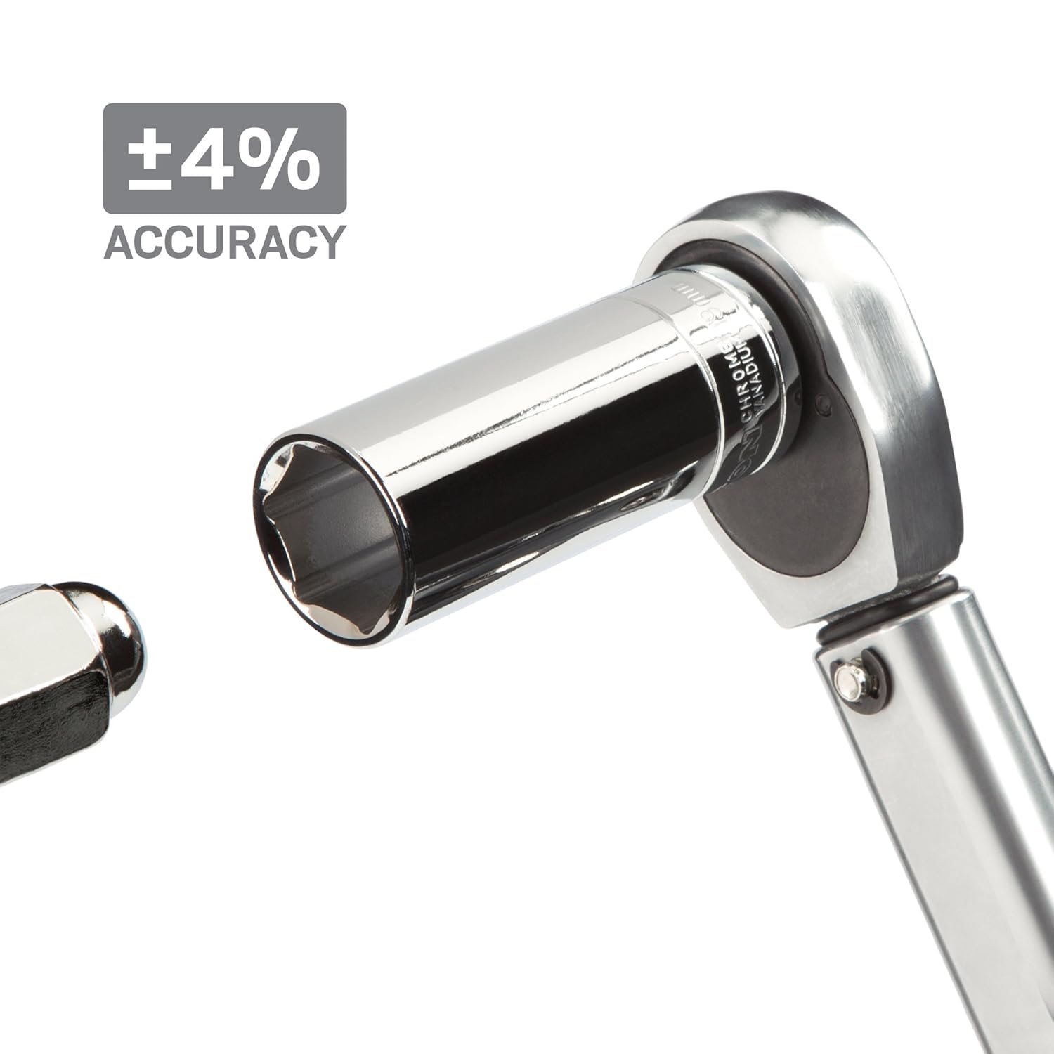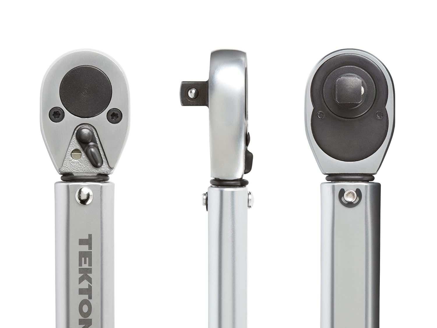 Calibrated to an accuracy of +/- 4%, the TEKTON 3/8 in. Drive Click Torque Wrench lets you work with confidence, eliminating guessing and the common tendency to overtighten fasteners. Correctly tightening fasteners to a vehicle or equipment manufacturer's torque specifications ensures parts are properly secured without being damaged. Simple and easy to use, this wrench has a reversible ratcheting head that drives fasteners in both directions and measures torque in the clockwise direction. To measure torque, set the desired value on the handle scale (foot pounds or Newton meters) and begin tightening the fastener. When the preset torque value is reached, a reliable mechanical operation inside the handle produces a click you can hear and feel, alerting you to stop applying force. Built for consistent performance and years of dependable service, the mechanical design doesn't need batteries, and the all-steel construction has no plastic parts to break or wear out.