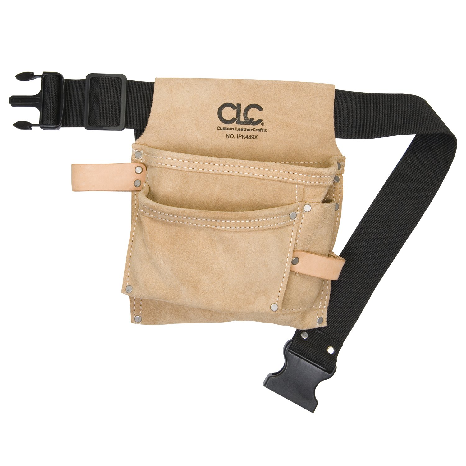 This 3-pocket nail and tool bag is the perfect solution for small construction projects or specialty work where you don't need a full rig. Our heavy-duty suede leather pouch incorporates a poly web belt with a quick-release buckle. Along with an integrated tape measure holder and hammer holder, this tool pouch helps keep everything close at hand.