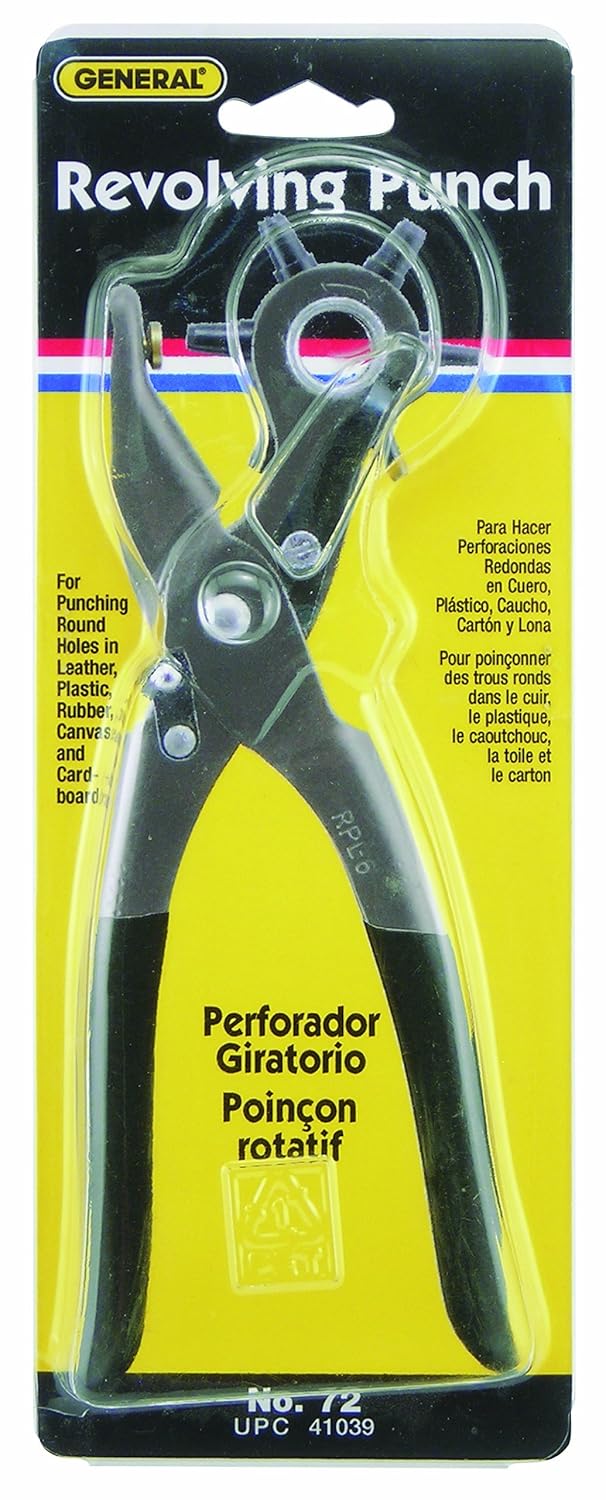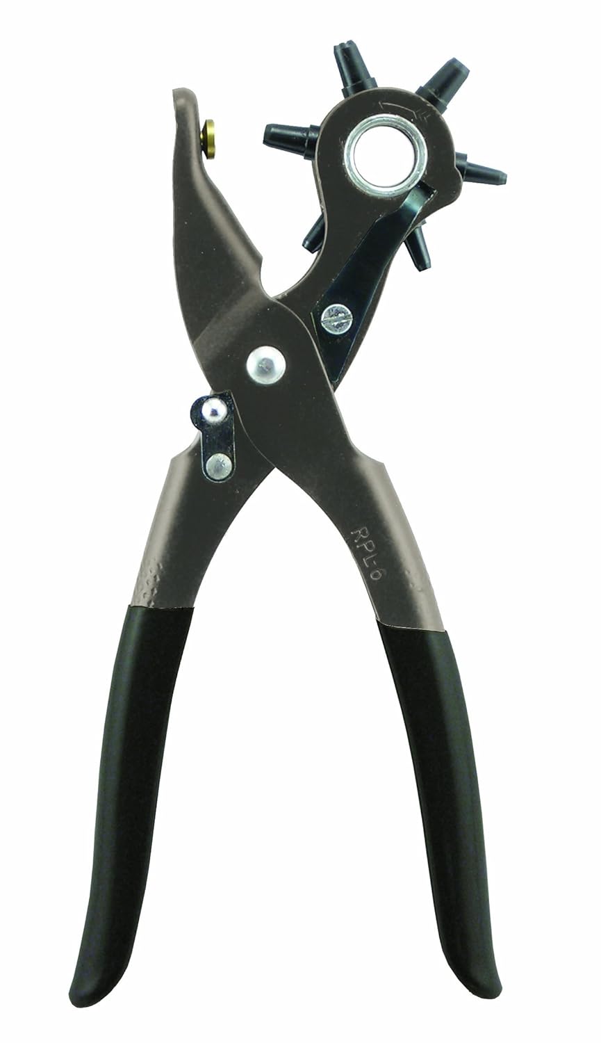 The Revolving Punch Pliers are ideal for making miniscule punch holes that would not be practical with a single-style punch. The revolving turret offers six distinct punch sizes for use on leather, rubber, plastic and similar materials. This tool is commonly used around the home for hobbies and crafts, or for adding additional holes to a leather belt.