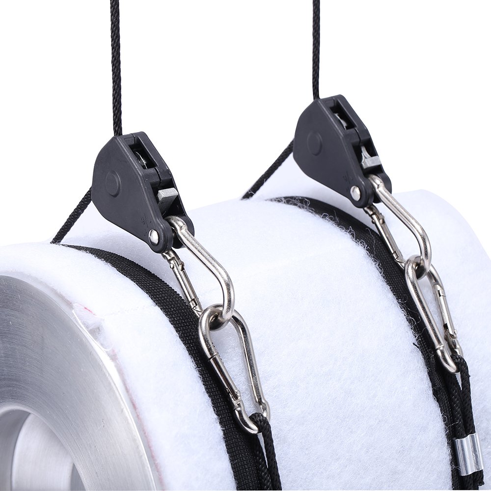 For filters, we recommend that you attach the free end with the carabiner around the filter to avoid rotation of the filter when hoisting. Support the filter when hoisting it to avoid stress on your grow tent frame.