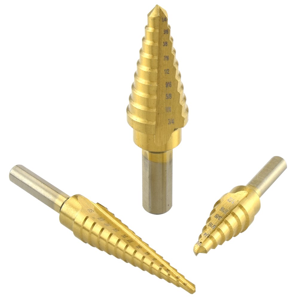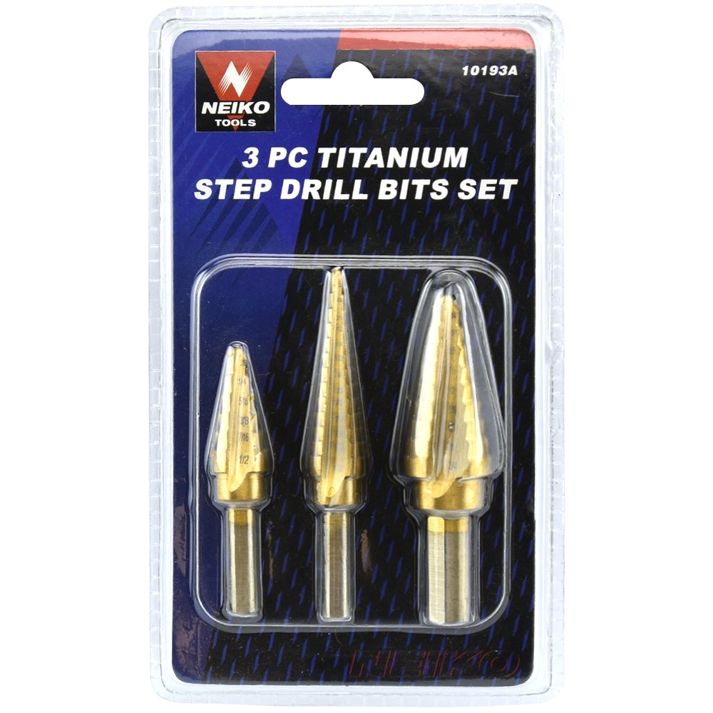 This compact set replaces 28 individual drill bits. 3pc Step Drill Bits. 1/8"- 1/2", 3/16"- 1/2", 1/4"- 3/4". Two-flute design for faster, smoother cutting. Package comes with one 3/16-inch to 1/2-inch six-step bit, titanium coated. One 1/4-inch to 3/4-inch nine-step bit, titanium coated.