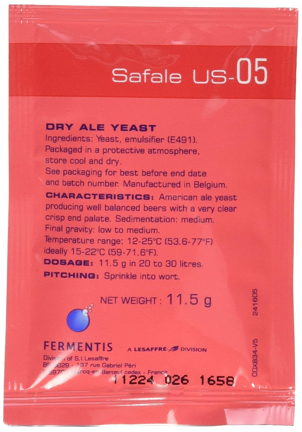 A ready-to-pitch dry American ale yeast. Safale us-05 produces well balanced beers with low diacetyl and a very clean, crisp end palate. Sedimentation: low to medium. Final gravity: medium.