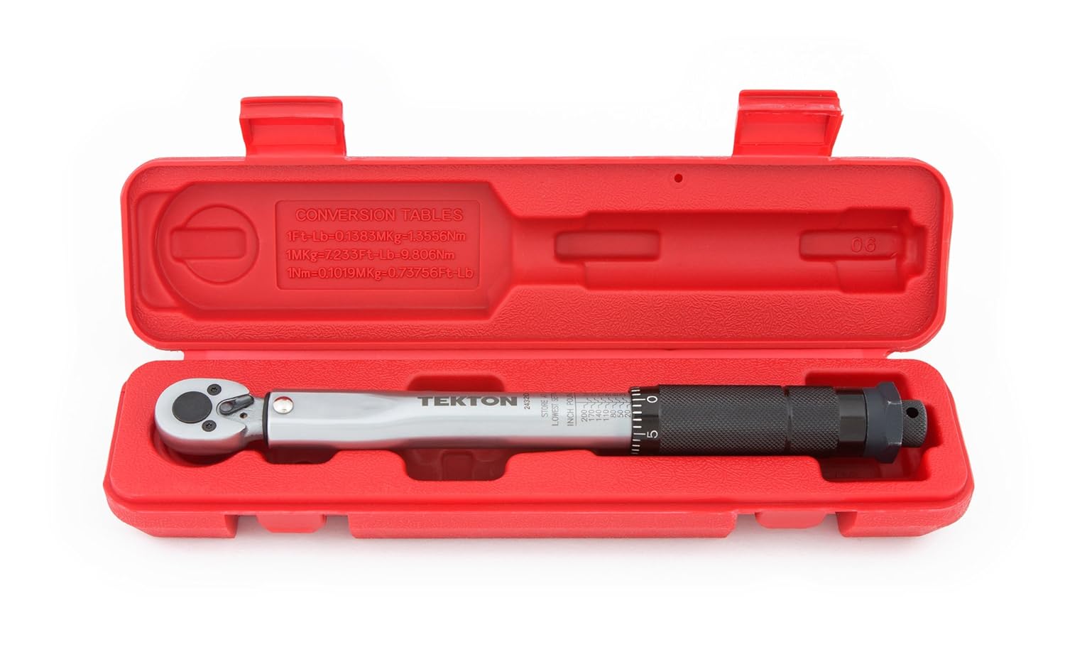 Calibrated to an accuracy of +/- 4%, the TEKTON 1/4 in. Drive Click Torque Wrench lets you work with confidence, eliminating guessing and the common tendency to overtighten fasteners. Correctly tightening fasteners to a vehicle or equipment manufacturer's torque specifications ensures parts are properly secured without being damaged. Simple and easy to use, this wrench has a reversible ratcheting head that drives fasteners in both directions and measures torque in the clockwise direction. To measure torque, set the desired value on the handle scale (inch pounds or Newton meters) and begin tightening the fastener. When the preset torque value is reached, a reliable mechanical operation inside the handle produces a click you can hear and feel, alerting you to stop applying force. Built for consistent performance and years of dependable service, the mechanical design doesn't need batteries, and the all-steel construction has no plastic parts to break or wear out.