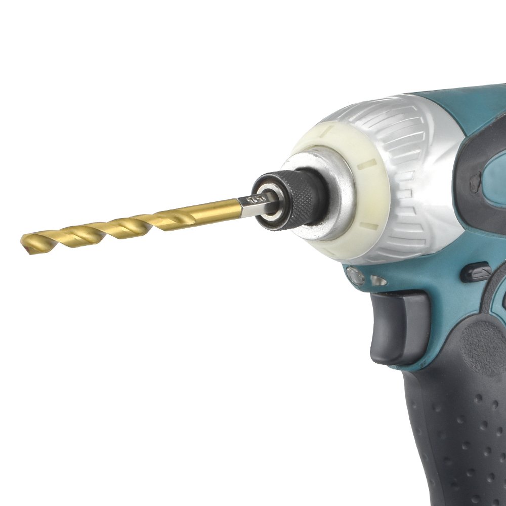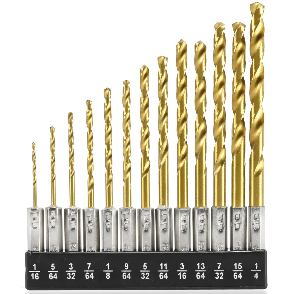 Professional high quality High speed steel titanium coated for longer life. 1/4" Hex Shank for Quick Change. Sizes: 1/16", 5/64", 3/32", 7/64", 1/8", 9/64", 5/32", 11/64", 3/16", 13/64", 7/32", 15/64", 1/4".